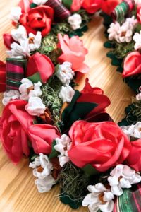 大きさの違う大きなバラのリボンレイ。